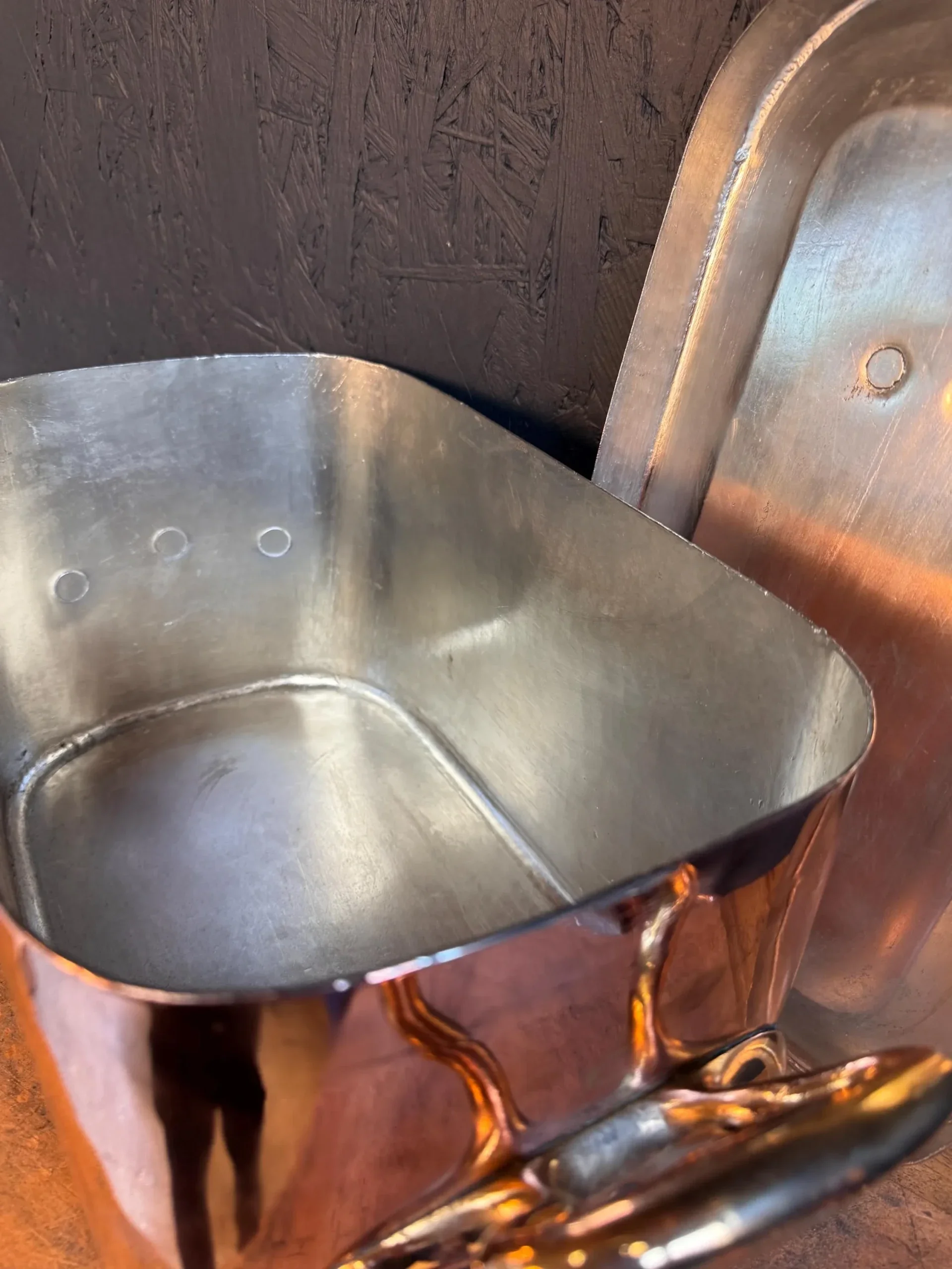 The pan features beautiful dovetailed seams, thick copper walls, and a new food-safe tin lining, ready for both display and practical use.